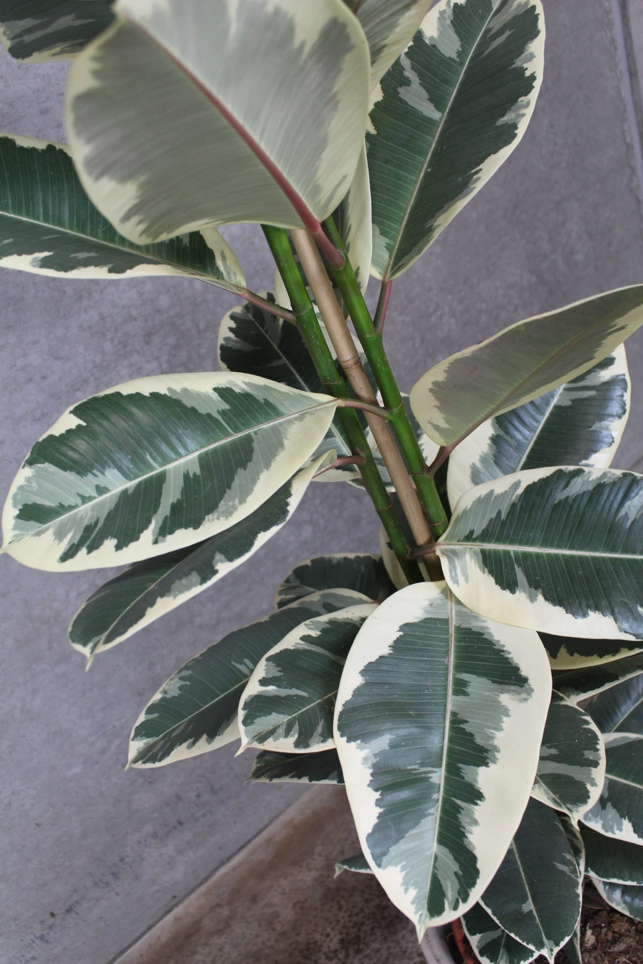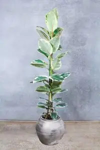 Også kendt som Broget Gummifigen – har unikke grønne og gule blade, som ikke ses ved andre Gummiplanter. De smukke farver giver et eksotisk udseende, som står i god kontrast til møbler af lidt tungere og mørkere karakter.