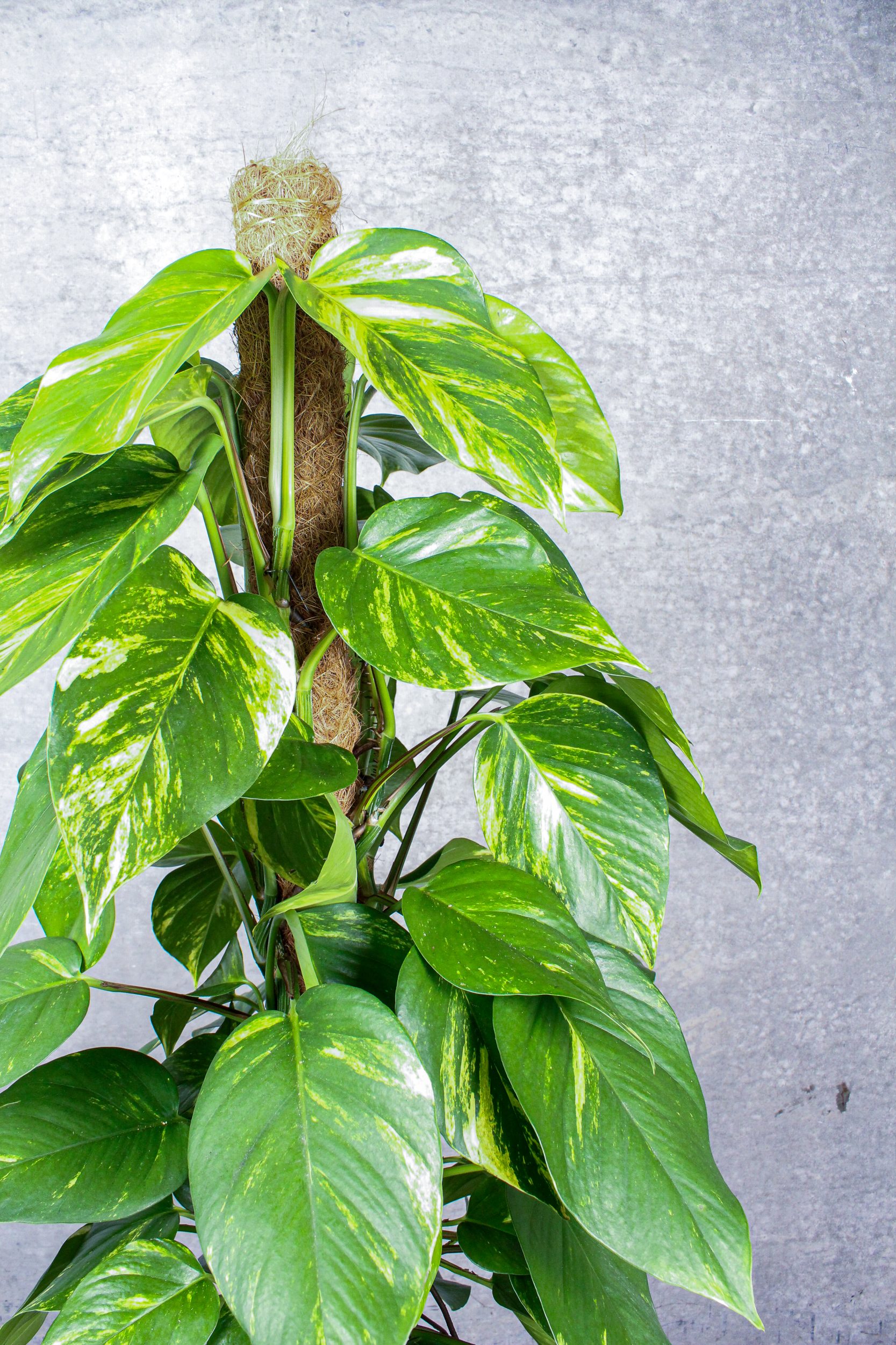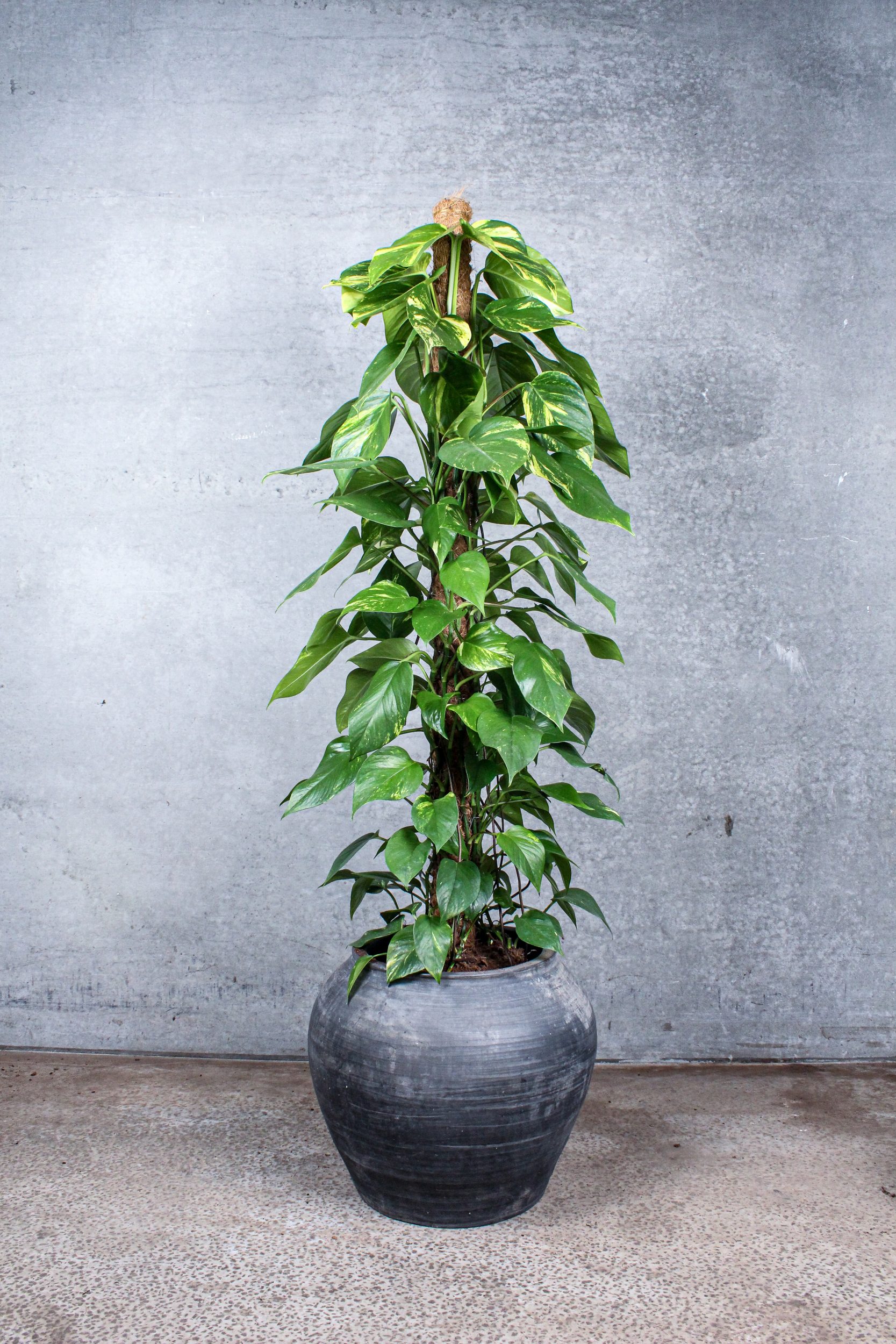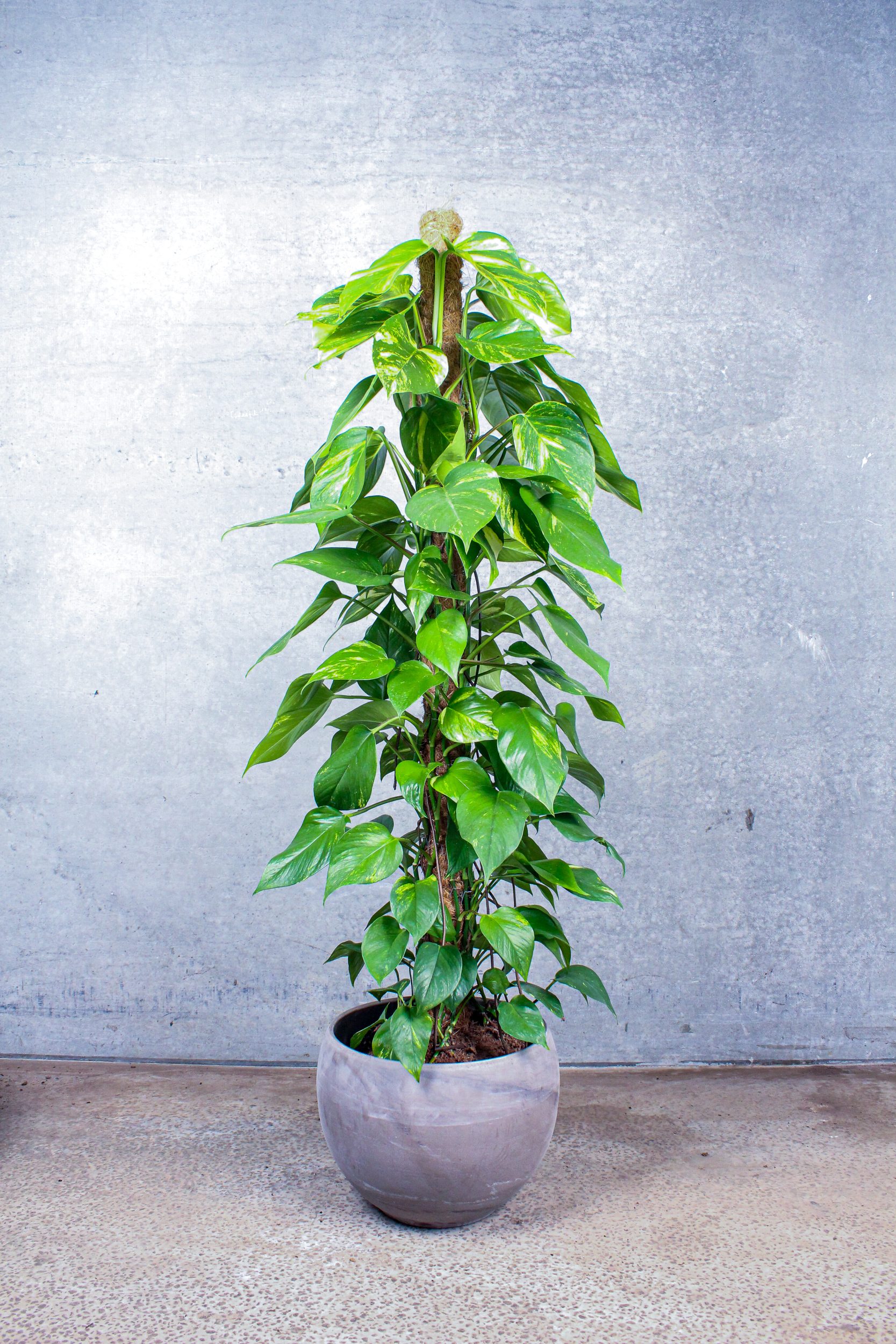 En rumdeler med dokumenterede luftrensende egenskaber, der skaber et sundere indeklima i kontormiljøer og wellnessområder. De hjerteformede blade vokser op ad mosstokken.